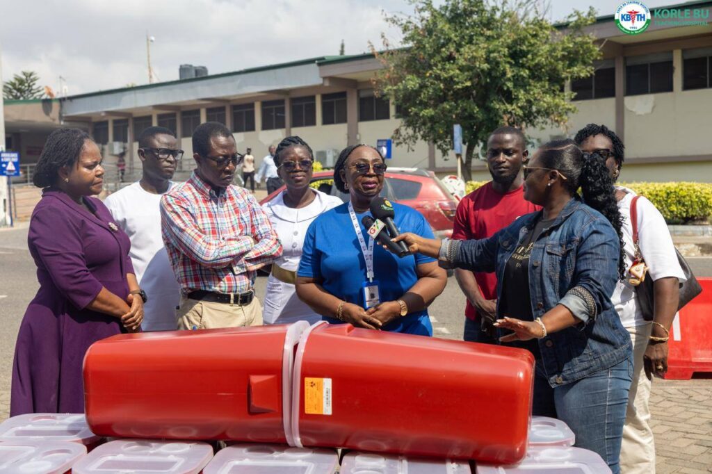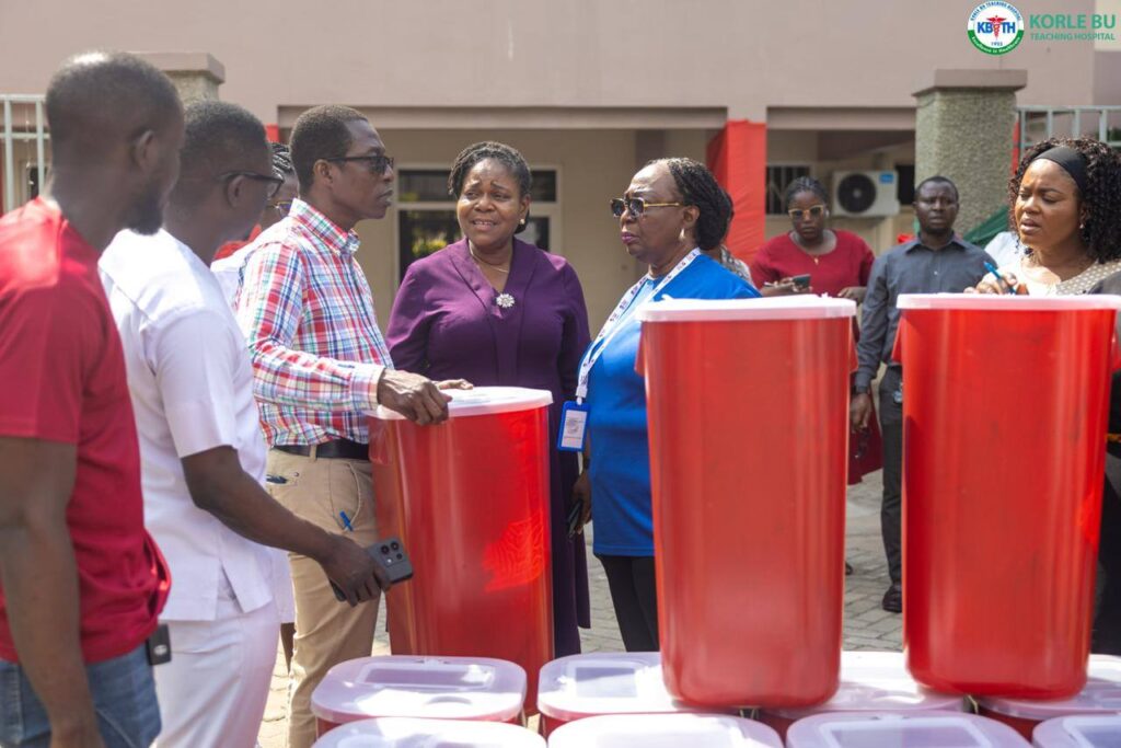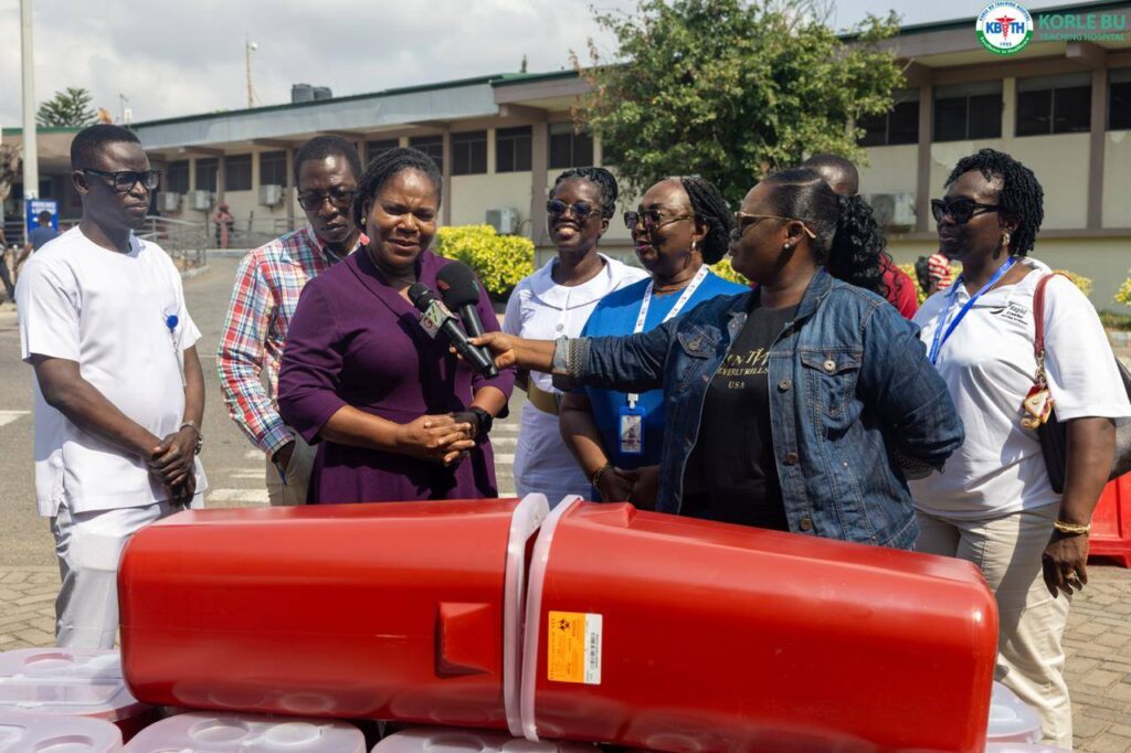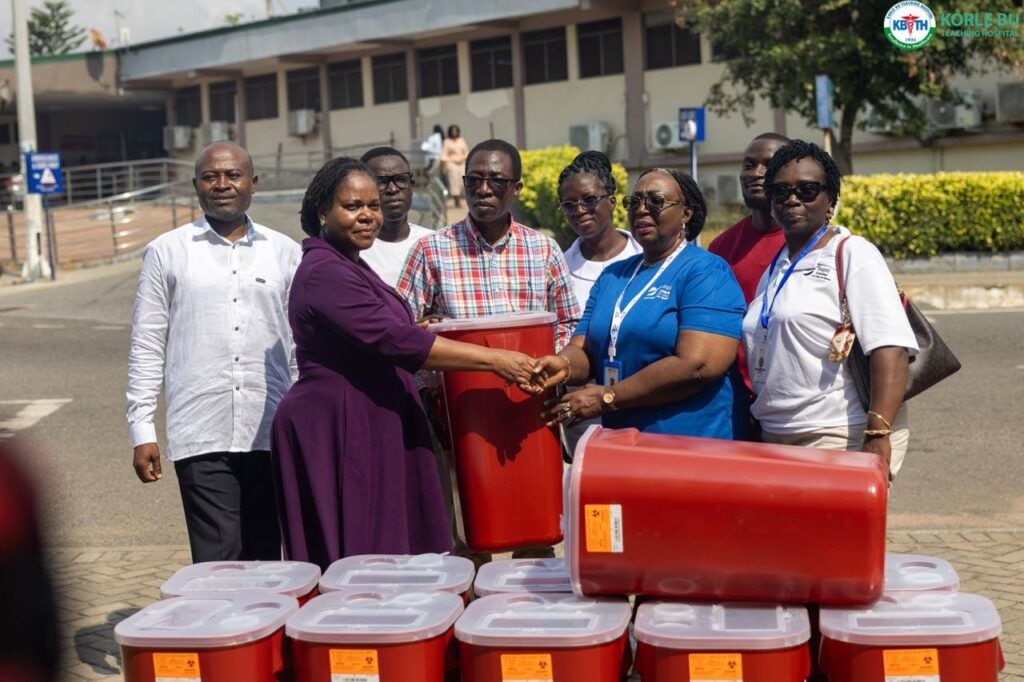 A three-member delegation from Rapid Courier Ghana, led by the Director of Operations, Mrs. Dinah Brandful, has donated 350 biohazard medical bins to support effective waste management in Korle Bu.
